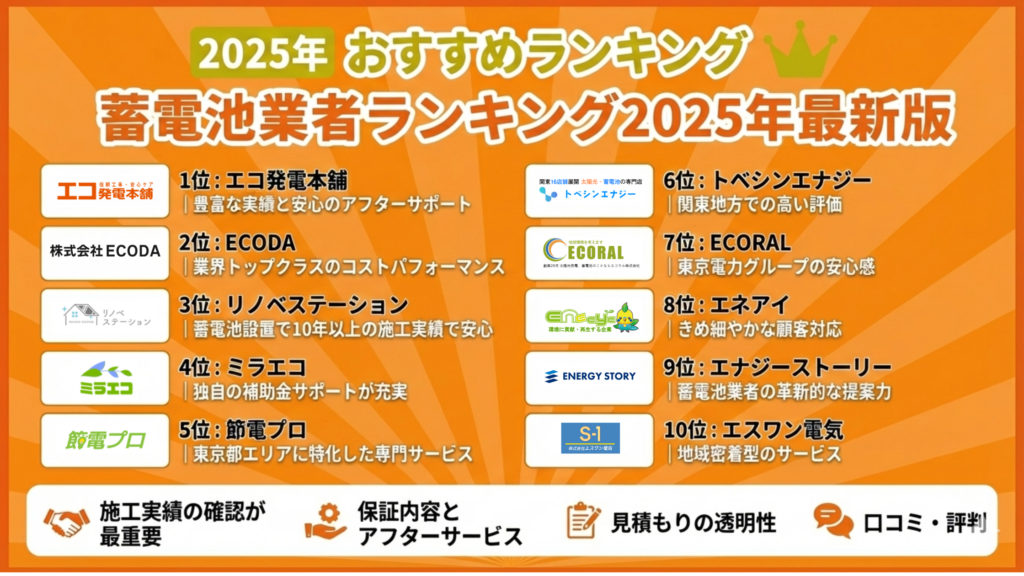 蓄電池業者ランキングおすすめ10社を徹底比較!【2025年最新版】基礎知識や選び方・注意点まで紹介